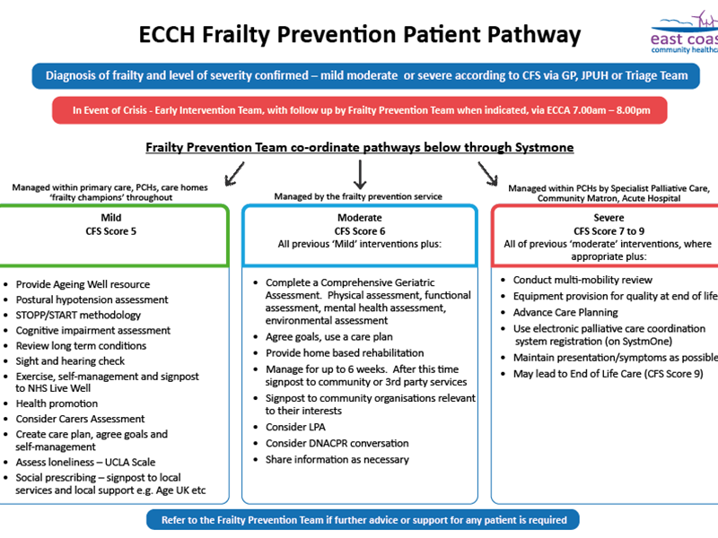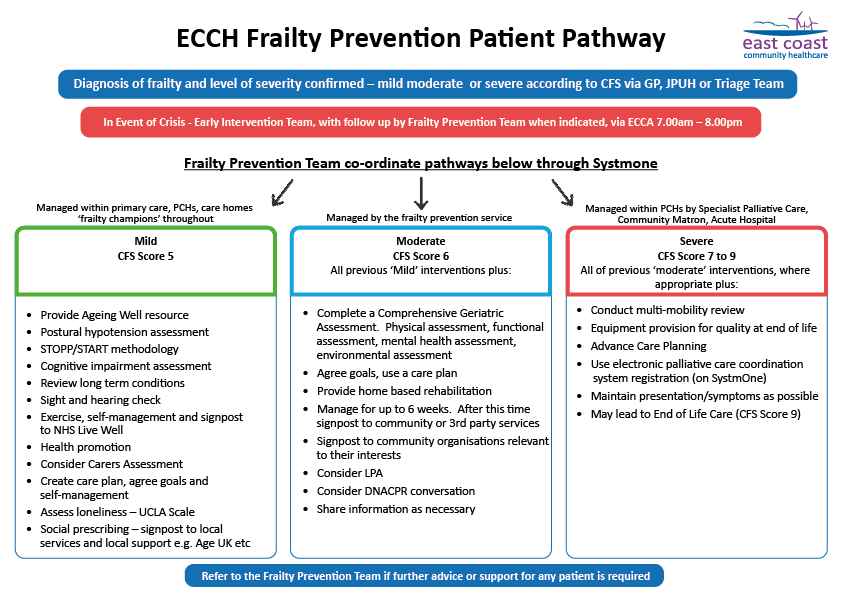 The below referral pathway highlights how the Rockwood score helps to shape which services patients receive from different parts of East Coast Community Healthcare – those with a moderate score for frailty are supported by our team.